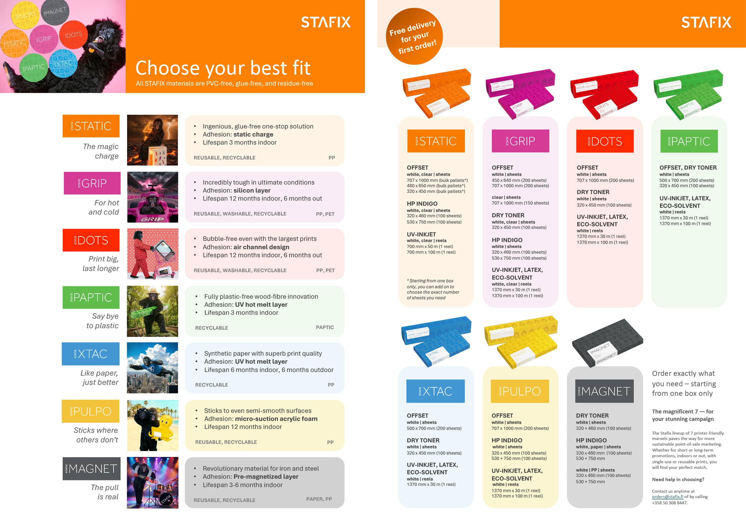 Say hi to the seven Stafix products: STATIC, GRIP, DOTS, PAPTIC, XTAC, PULPO, and MAGNET. They all share the same qualities of efficiency, ease of use, and eco-friendliness — but each brings its own special power to your campaign.